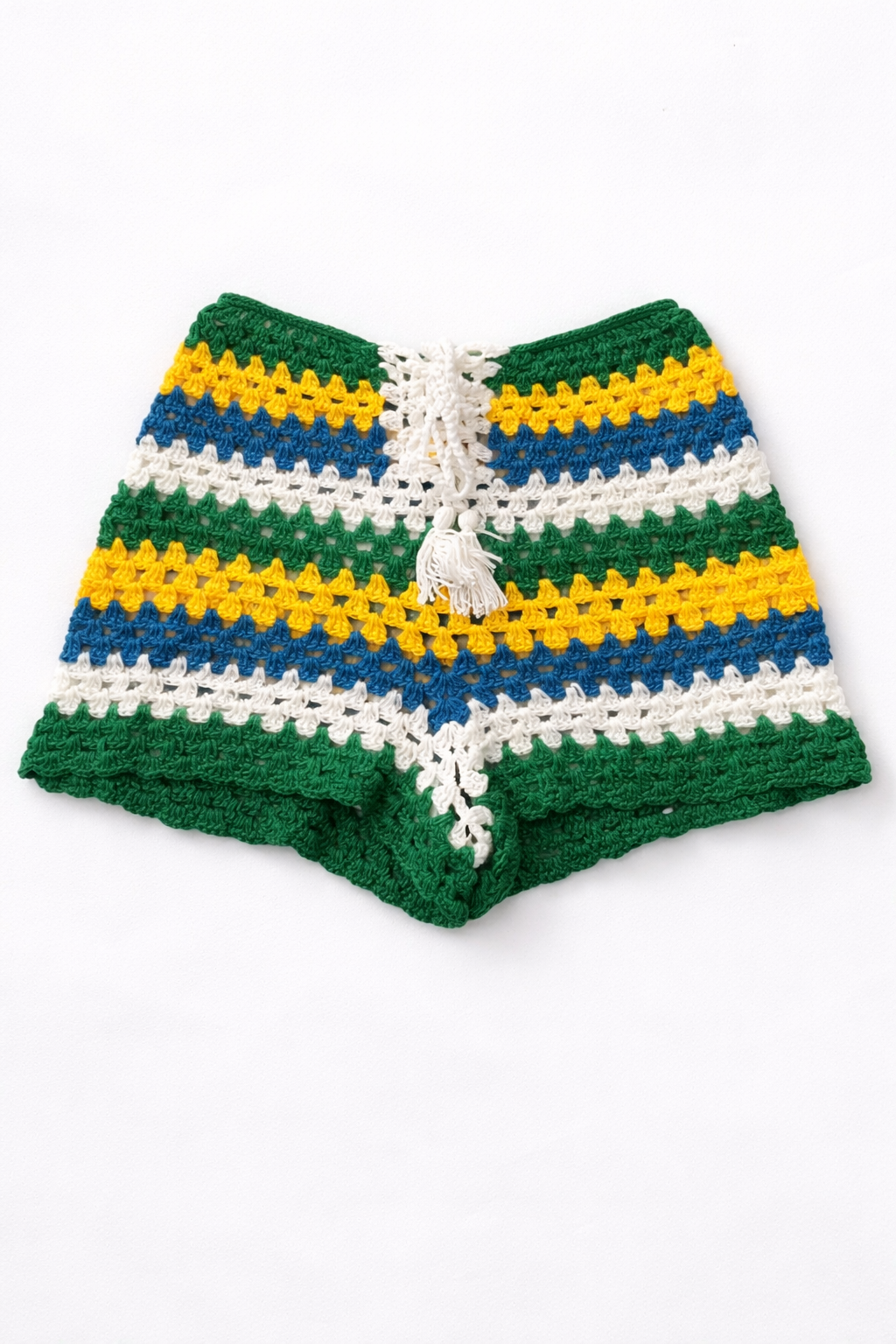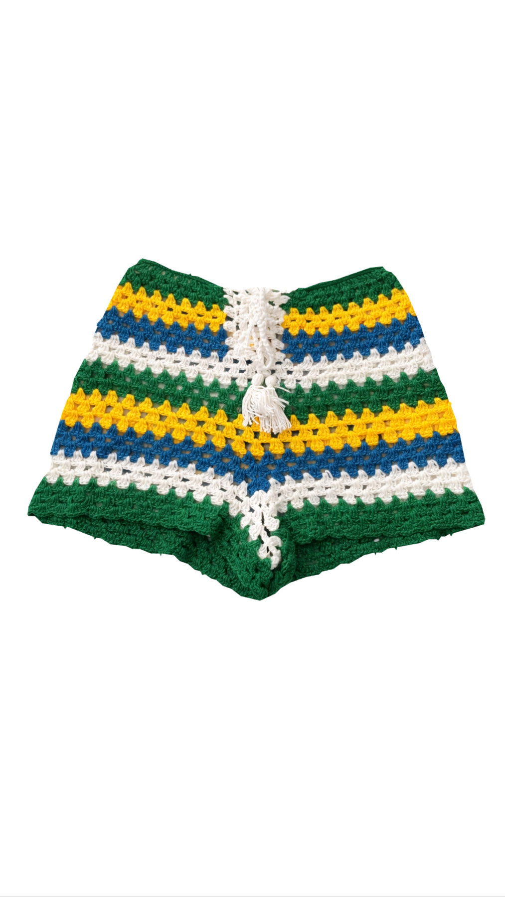 Shortinho de crochet feito a mão, com linha 100% algodão nas cores do Brasil. Edição Limitada!